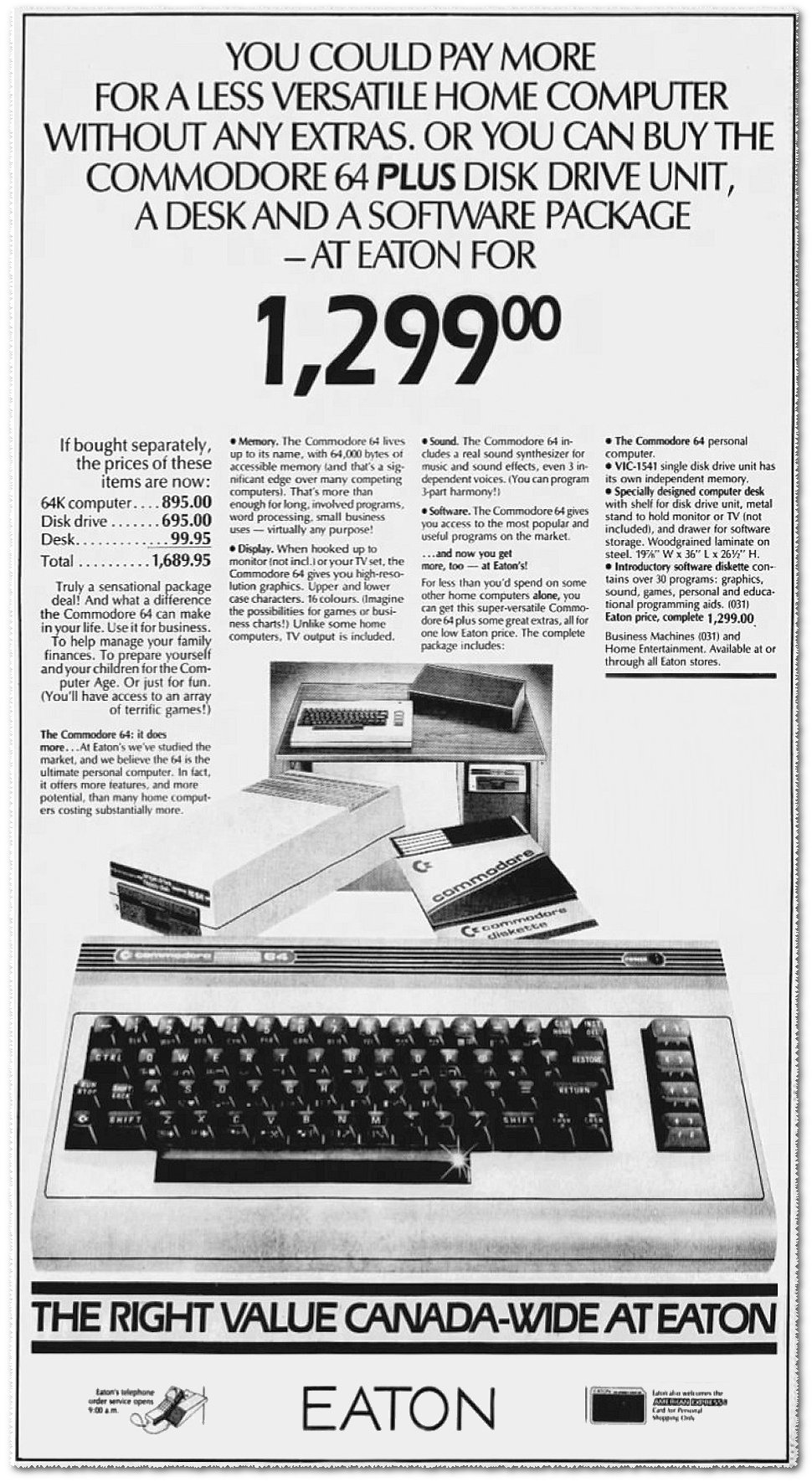 Then 1982 rolled around and I remember seeing an ad in COMPUTE! magazine for the all-new Commodore 64. 64k of memory? I couldn't believe it. This was incredible and exciting news. I can still remember seeing my first C64 on display in The Bay department store near where we lived. I remember playing around with it and thinking 40 text columns and 16 colours was amazing. I started my campaign to convince my parents that I needed an upgrade. This was a big ask, and it was tough convincing them, but one day my mother showed me a newspaper ad from Eaton's (another major Canadian department store). The ad was for a "sensational package deal"... You could pay more for a less versatile home computer without any extras. Or you can buy the Commodore 64 plus disk drive unit, a desk and a software package – at Eaton for 1,299.00.